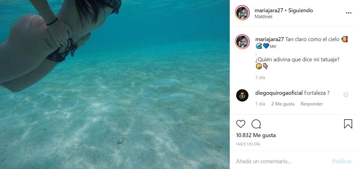 En la imagen se ve sumergida en el mar utilizando un diminuto traje de baño en el que se puede apreciar también un tatuaje que tiene en su pierna derecha. La también modelo aprovechó su paradisíaca publicación para que sus seguidores adivinaran qué dice: “tan claro como el cielo. ¿Quién adivina qué dice mi tatuaje?”.