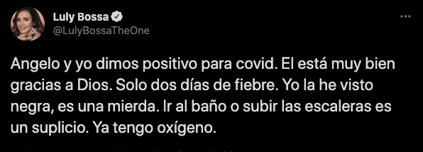De tal orden ha sido lo acontecido que Luly Bossa ha tenido que usar oxígeno para poder sobrellevar las dificultades con el virus.
