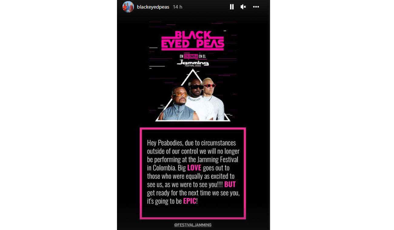 “Debido a circunstancias fuera de nuestro control ya no nos presentaremos en el Festival Jamming en Colombia. ¡Un gran amor para aquellos que estaban tan emocionados de vernos como de verlos a ustedes! pero prepárate para la próxima vez que te veamos, nuestro reencuentro va a ser épico”, escribió Black Eyed Peas en el post, sin dar información del por qué esa decisión.