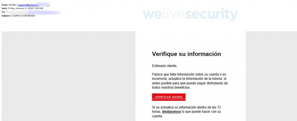 De acuerdo con la investigación, esta estafa se ejecuta a través de un correo en el que se le indica a la víctima que a raíz de una falta de información en su cuenta de Netflix, la plataforma suspenderá su usuario si no actualiza sus datos en un periodo de 72 horas.