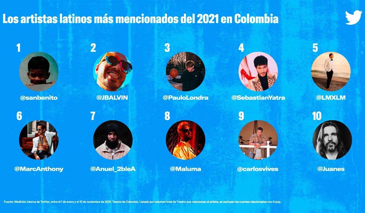 Pese a que el ranking es encabezado por Bad Bunny, J Balvin, Juanes, Sebastián Yatra y Carlos Vives aparecen como los representantes de los sonidos colombianos y del talento musical que ofrece nuestro país.