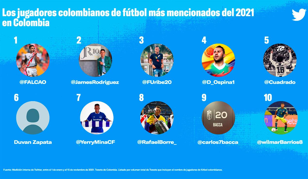 Los fanáticos del fútbol suelen conectarse en Twitter con otros hinchas para hablar de sus jugadores favoritos. En esta ocasión Radamel Falcao ocupó el primer puesto del listado, seguido de James Rodríguez (@jamesrodriguez).