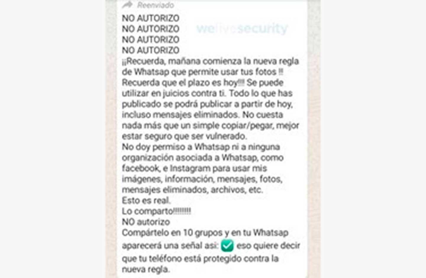 Recientemente un equipo de expertos de Eset, compañía especializada en ciberseguridad, detectó un mensaje falso que circula en WhatsApp indicando que es posible evitar o "no autorizar" que la aplicación aplique los cambios en las políticas de privacidad, relacionadas con los datos del usuario.