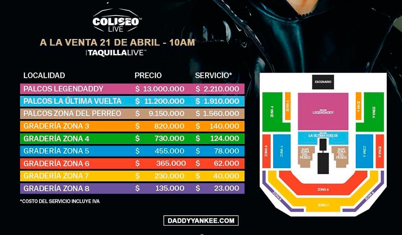 Ahora Taquilla Live reveló los precios para el concierto que el reguetonero hará en Bogotá, el cual se realizará en el Coliseo Live. Dicha zona estará dividida en nueve zonas, con tres tipos de palcos y seis posibilidades de graderías.