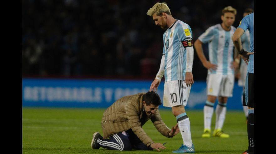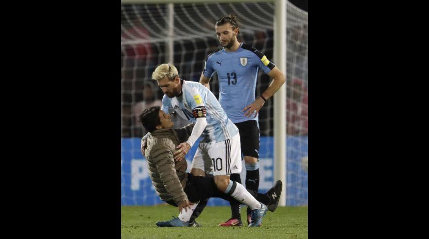 En medio del partido de anoche entre Argentina y Uruguay en el que el astro celeste Lionel MessiSigue las noticias de La Mega en Whatsapp marcó el gol de la victoria, se vio interrumpido al finalizar el duelo cuando un fanático hincha argentino invadió el campo y le hizo venia. Vean las imágenes a continuación: