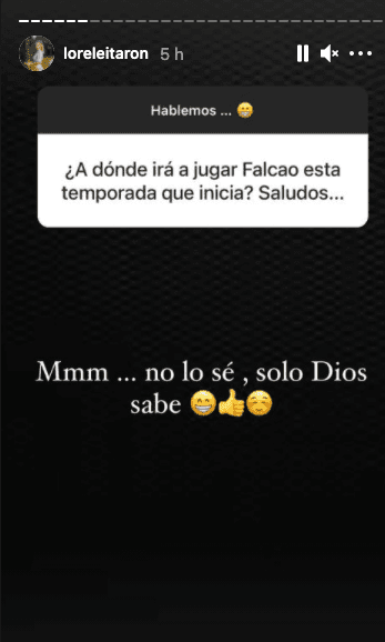 Ante estas preguntas, Lorelei respondió que no sabe donde jugaría el ‘Tigre’ en la presente temporada; sin embargo, señaló que “solo Dios sabe” el futuro que le deparará al samario. Asimismo, dejó en claro que si Falcao no ha vuelto a jugar es por decisiones ajenas, pero que “hay que respetar. Ya llegará el momento”.