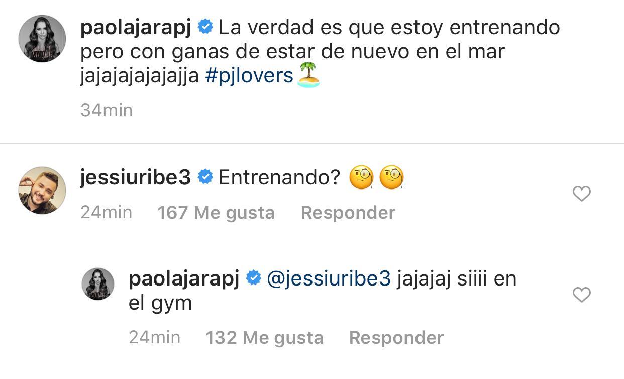 "Jessi Uribe jajaja entrenando para volver a la playa eso es lo que esta haciendo", "Vean... yo los apoyo y todo... pero ya dejen de actuar por favor... todos queremos ver la mejor pareja del mundo", "Yo los apoyo también y me parece hermosa su relación pero por favor No lo hagan público dejen que la gente hable toda la mie$%& que quieran", "jajaja Jessi sin celos pues", "Paola la buena mano ayuda jaja la felicidad se refleja" fueron algunos de los comentarios que recibió la pareja en la publicación.
