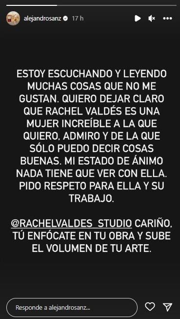 Se rumorea que la ruptura habría sido tiempo antes de que Sanz compartiera el emotivo mensaje, no obstante, hasta al momento se desconoce si es verdad o no, lo que sí es cierto, es que recientemente Alejandro salió a defender a Rachel en su redes sociales, ya que según el artista no le gusta lo que está escuchando y leyendo acerca de ella, pues aseguró que es una mujer "increíble" y nada de lo que está pasando con su estado de ánimo está relacionado con la misma.