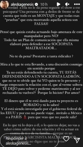 Ante el pronunciamiento de Espino la modelo salió al paso y lanzó otras declaraciones. Por medio de sus historias de Instagram Aleska Génesis quiso advertirle de una vez lo que le espera a la presentadora al estar junto a una persona como Miguel Mawad.