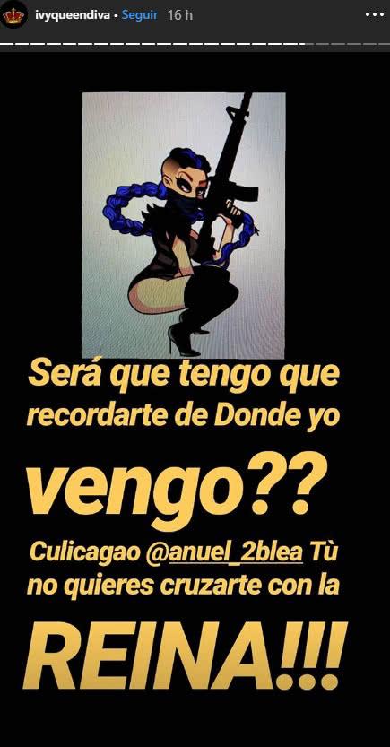 'Ivy Queen' no tardó en responder. De igual forma, por medio de su cuenta de Instagram la intérprete de 'Yo Quiero Bailar' no dudó en decirle a Anuel AA que, "culicagao, ¡tú no quieres cruzarte con la reina!".