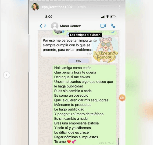 Además, confesó que Manuela fue la primera persona que le compró publicidad y que gracias a esto ella se compró su cama y televisor a los 18 años. Incluso, se hizo pública una captura de pantalla donde Epa le escribía a Gómez ofreciéndole su ayuda como un obsequio.