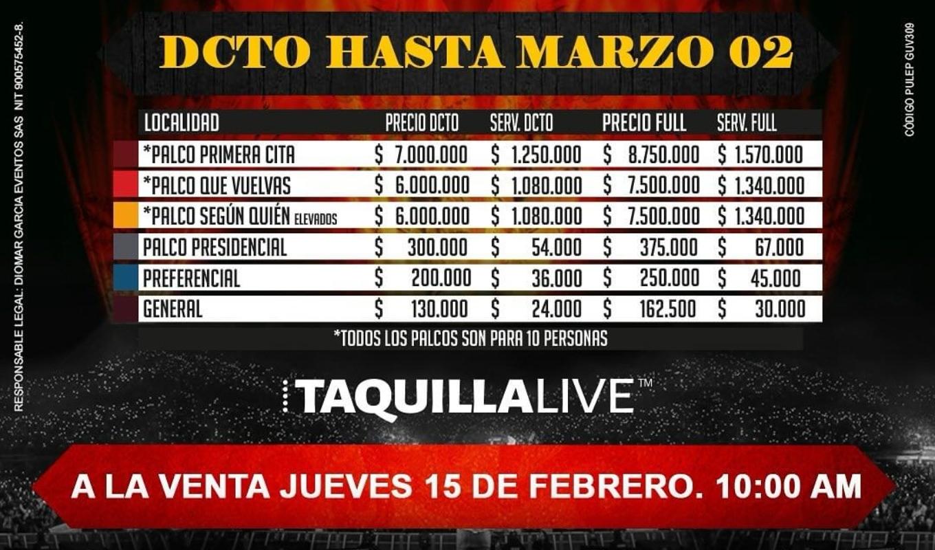 Para asistir al concierto de Carín León en Medellín, pueden adquirir sus entradas a través de la página oficial de Taquilla Live, que estarán en preventa este jueves 15 de febrero desde las 10:00 de la mañana, y se encuentran en un rango de precio desde 8.750.000 el palco más costoso, y 162.000 pesos la boleta más barata.