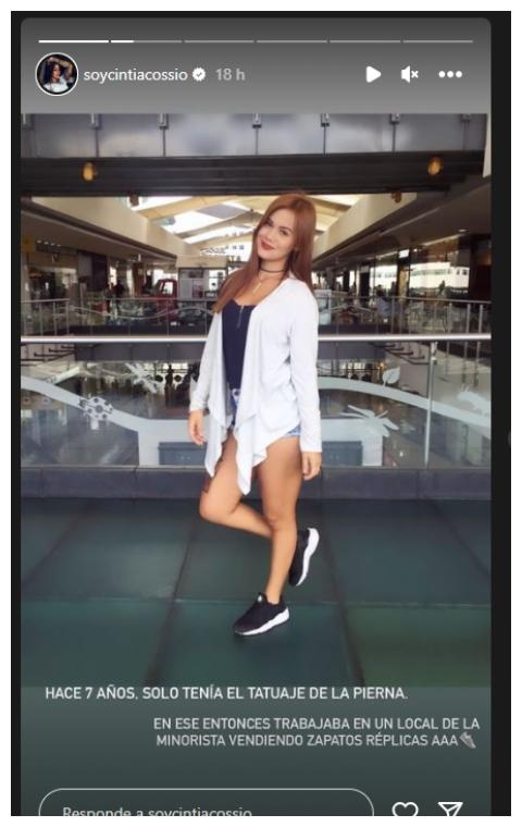 Recientemente, Cintia Cossio reveló una foto de cuando tenía 20 años y su cabello era de otro color, es decir, hace 7 años. En la descripción de la imagen dice que ella "en ese entonces trabajaba en un local de la minorista, vendiendo zapatos réplicas AAA". Allí lució un short, una camisa larga y unos tenis en pleno centro comercial.