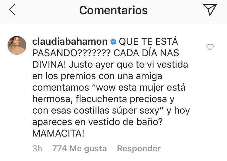 “¿Qué te está pasando? Cada día más divina. Justo ayer que te vi vestida en los premios con una amiga comentamos: wow, esta mujer está hermosa y con esas costillas. ¿Y hoy apareces en vestido de baño? ¡MAMACITA!”, escribió Bahamón en los comentarios de la foto.