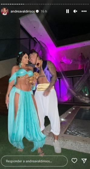 De acuerdo a las virales historias, Andrea Valdiri asistió al evento con un sensual traje azul y larga cabellera negra, mientras que su esposo Felipe Saruma, la acompañó vestido de Aladín, el famoso personaje que salva a la princesa Jazmín y logra enamorarla.