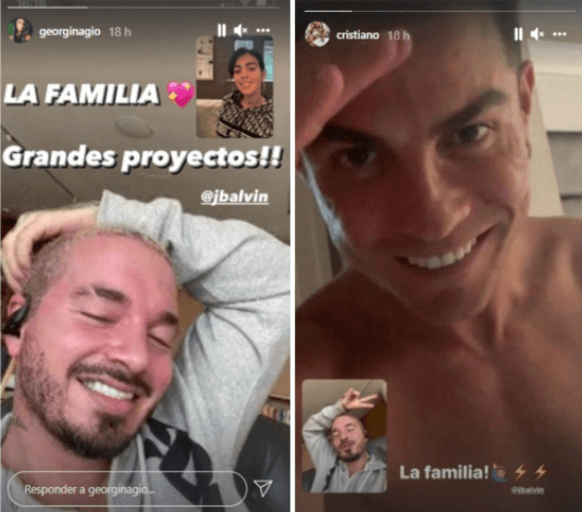 Balvin, que será cabeza del Festival Estéreo Picnic, mostró a través de sus redes sociales que adelantó videollamadas con la pareja, aunque cada una fue por separado. "La Familia. Grandes proyectos", fueron las palabras que escribió el colombiano en las publicaciones con Cristiano y Georgina.
