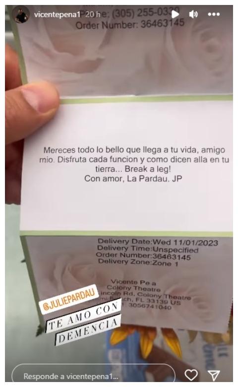 Ahora bien, Juliette Pardau le envió flores a un reconocido actor venezolano cuyo nombre es Vicente Peña. En sus redes sociales se pudo ver el mensaje que le envió junto al detalle que le envió. "Mereces todo lo bello que llega a tu vida, amigo mío. Disfruta cada función y como dicen allá en tu tierra... Break a leg. Con amor, La Pardau. JP", dice la carta.