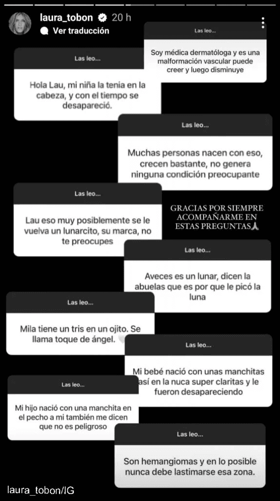 Precisamente relacionado a esto, una nueva historia de Laura Tobón tiene a sus seguidores comentando activamente, pues según la publicación de la bogotana, su hijo tiene una mancha en uno de sus deditos de la mano y aunque ella asegura que el pediatra le dijo que se trataba de una malformación vascular de la cual no debía preocuparse, ella quiso preguntarle y pedir algunos consejos a las mamitas que hayan pasado por algo similar.