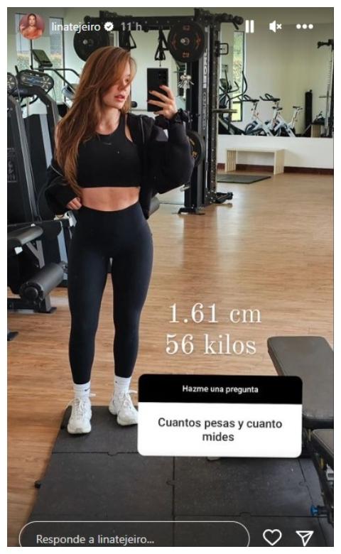 Recientemente, en una dinámica de preguntas y respuestas, un seguidor se atrevió a cuestionarle por su peso y estatura. A lo que, Lina Tejeiro le respondió lo siguiente: 1.61 centímetros y 56 kilos.