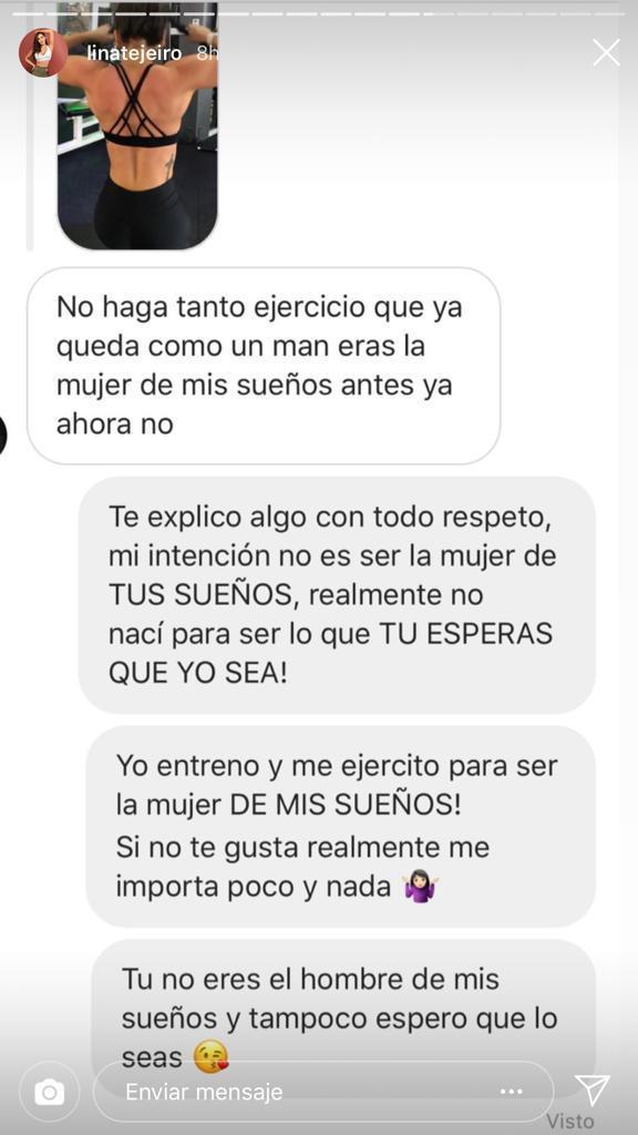 Sin embargo, hay algunos seguidores que se atreven a llegar un poco más lejos y no tienen problema en enviarle mensajes a Lina en donde critican su físico, personalidad y hasta algunas cosas de su vida personal.