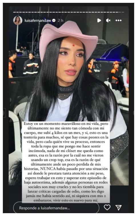 "Me subí cuatro kilos en un mes, y sí, esto es una tontería para muchos, sé que hay cosas peores en la vida, pero cada quien vive su proceso. Entonces, toda la ropa que me pongo me hace sentir incómoda. Nada de mi clóset me queda como antes. Esa es la razón por la que no me vieron usando un crop top", dijo Luisa Fernanda W.