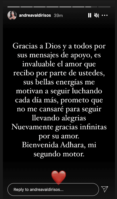 Sin embargo, ahora oficialmente Adhara ya nació y fue la misma Valdiri quien anunció la noticia con un mensaje en su cuenta de Instagram que dice: "Bienvenida Adhara, mi segundo motor".
