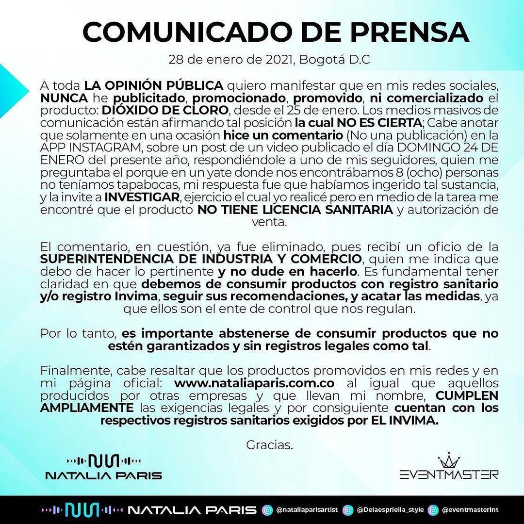 El pasado 24 de enero, en Instagram, Natalia París publicó un video de una fiesta en un yate. Posteriormente, dejó al menos cuatro comentarios en los que sugería consumir el dióxido de cloro. Incluso, le recomendó a una seguidora darle la sustancia a su familia: "Toma dióxido de cloro y dale a tu familia". Además, le dijo a otra persona que ese era el remedio que "te salva de vacunarte".