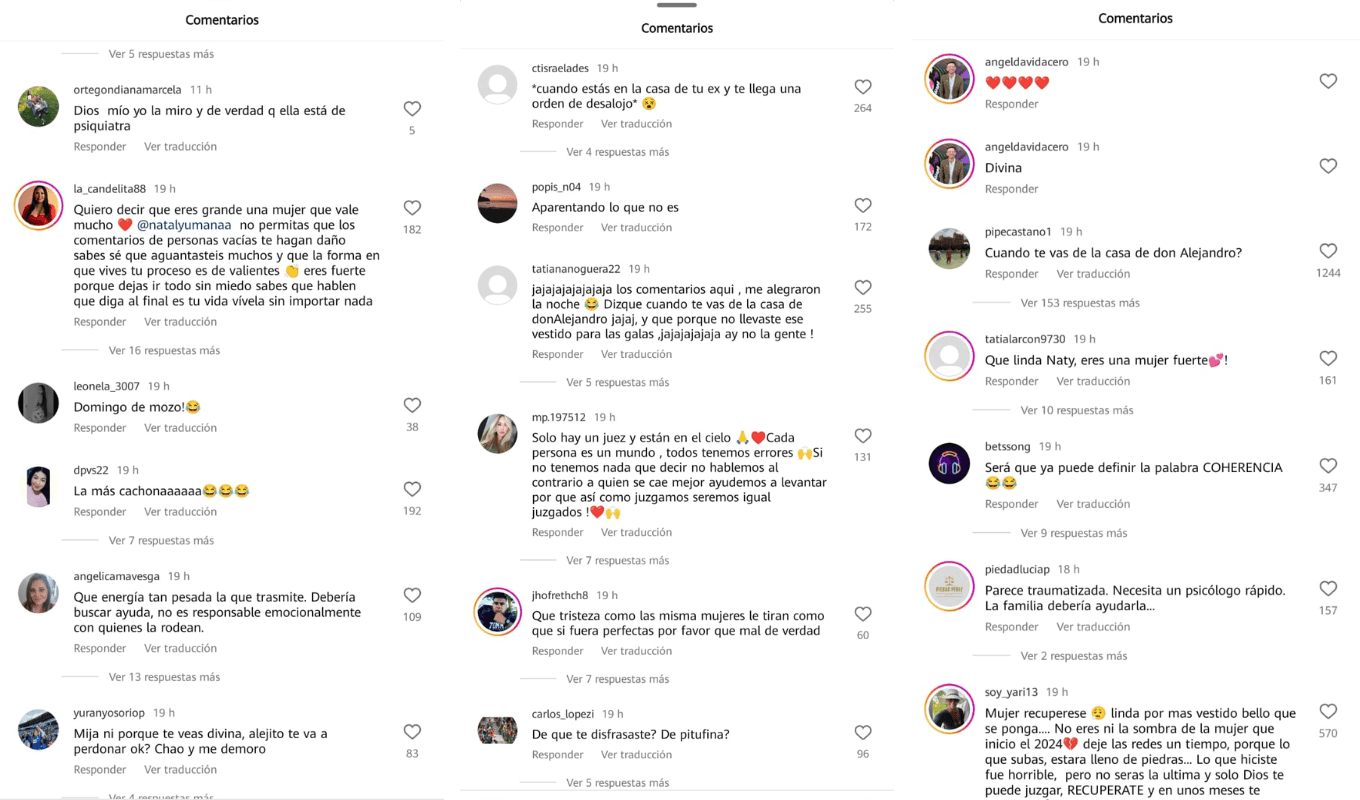 "¿Cuándo te irás de la casa de don Alejandro?", "Nataly, eres una mujer fuerte, pero ¿puedes definir la palabra coherencia?", "pareces traumatizada", "cuando estás en la casa de tu ex y te llega una orden de desalojo", son solo algunos de los comentarios que se pueden encontrar en las imágenes anteriores.