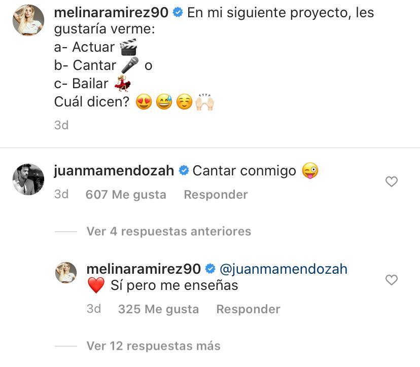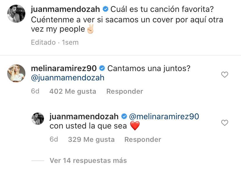 A lo que Melina no dudó en responderle con otro interrogante: “¿Cantamos una juntos?”. Juan sin tapujo le contestó: “con usted la que sea” y lo acompañó con un corazón rojo.