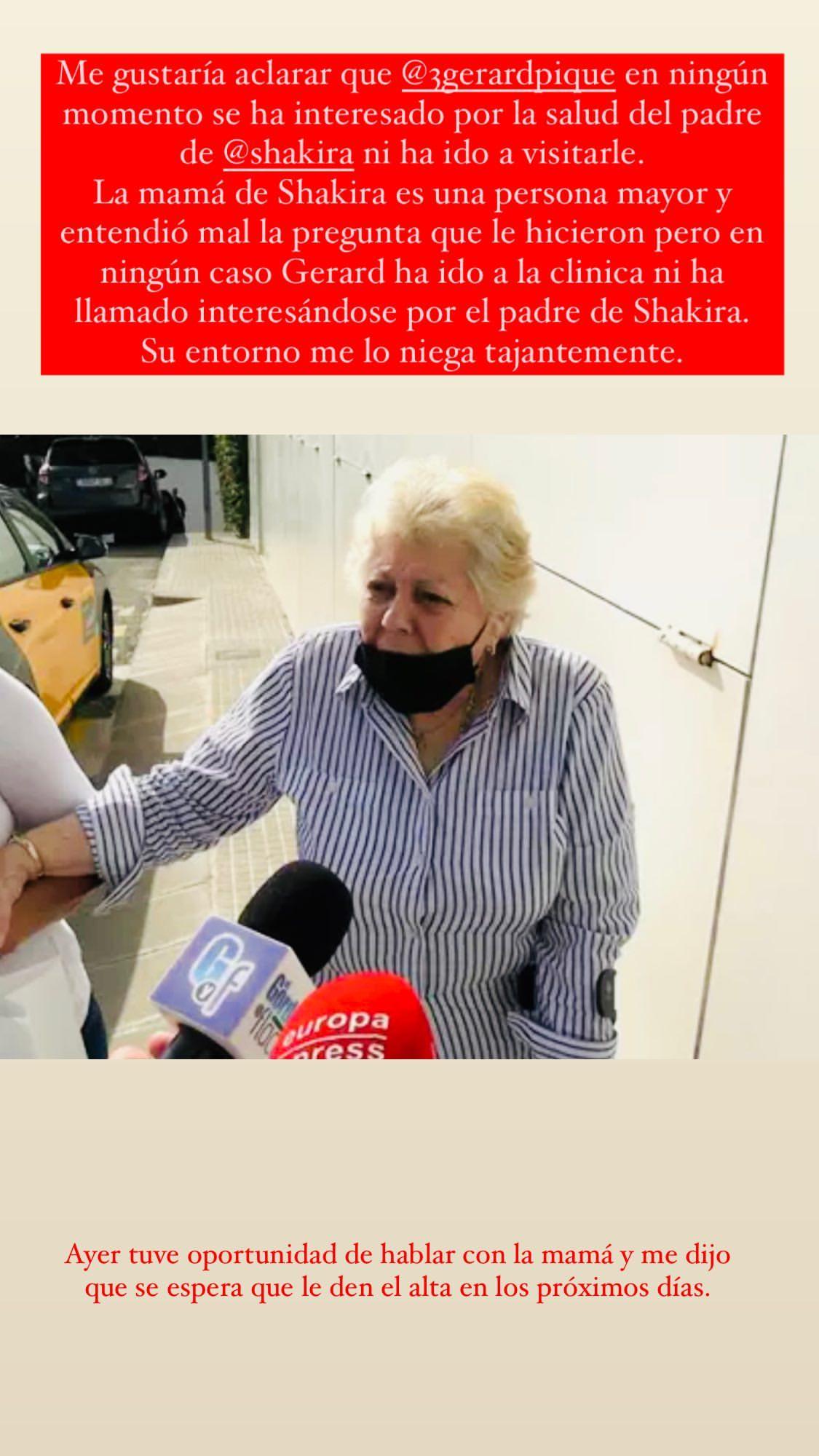 Unido a esta información, recientemente el también periodista Jordi Martí aclaró que lo dicho por la mamá de Shakira fue tomado de una forma que no era, ya que según él, Nidia Ripoll entendió mal la pregunta y nunca quiso decir que Piqué se había interesado en su esposo, pues por el contrario, el futbolista no se ha interesado en lo más mínimo en su estado de salud, ya que no ha llamado ni ha ido a visitarlo.