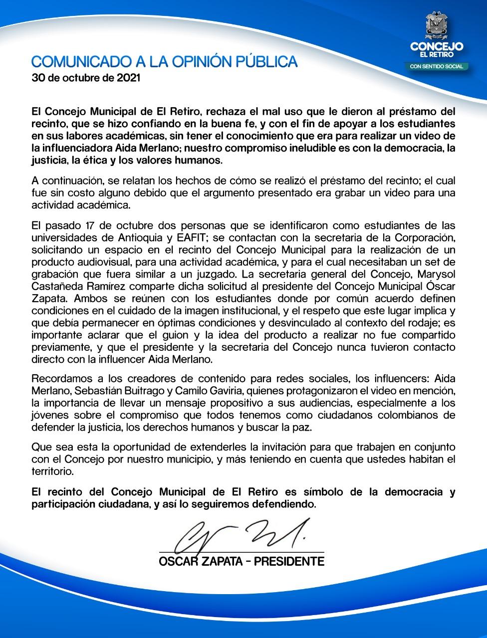 En un comunicado, el presidente del Concejo de El Retiro, Óscar Zapata, dijo que junto a la secretaria de la corporación, Marysol Castañeda, se reunió con los estudiantes para definir las condiciones en el “cuidado de la imagen institucional y el respeto” por el lugar.