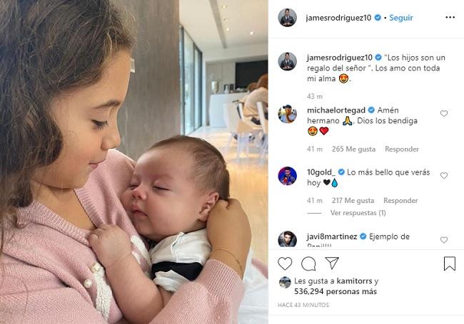 Por:James Rodríguez derritió de ternura a sus más de 40 millones de seguidores en Instagram, al publicar una imagen de sus dos hijos Salomé y Samuel. Lo curioso de la fotografía es que por primera vez podemos ver el rostro del pequeño, quien nació el pasado mes de octubre a través de un vientre de alquiler.