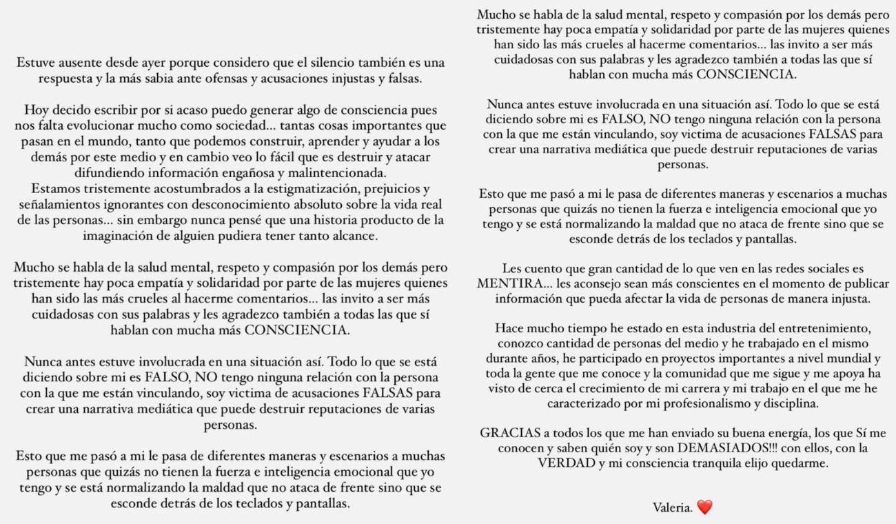 Por lo cual, Valeria también habló sobre el tema, quien dijo que todas las acusaciones eran falsas. "Soy víctima de acusaciones falsas para crear una narrativa mediática que puede destruir reputaciones de varias personas", expresó la joven. En sus redes no podía creer todo lo que habían dicho de ella y también de su amiga, Laura Sánchez.