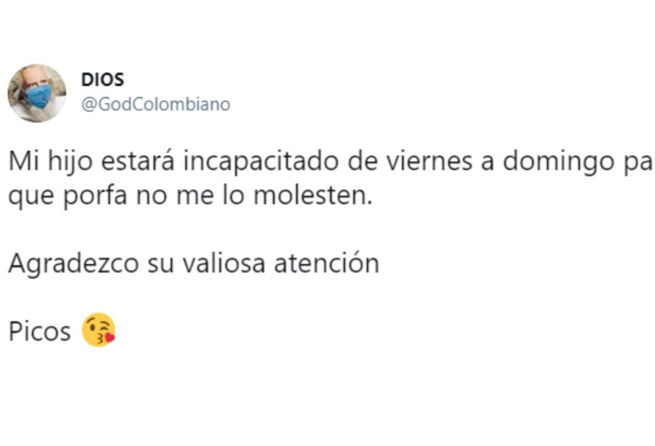 Ahora, aprovechando la llegada de la Semana Santa, God Colombiano decidió poner un divertido tweet indicando que su hijo (Jesús) estará incapacitado jueves y viernes de esta semana. Además, solicitó en el trino que no lo molestaran durante esos dos días.