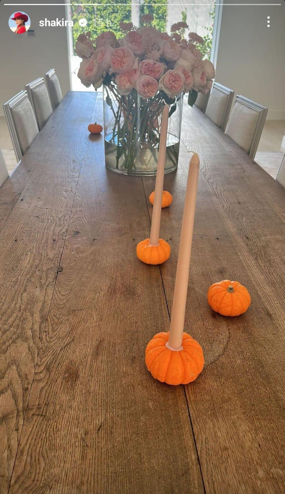 Las imágenes revelan que Shakira ha optado por un enfoque minimalista, combinando la elegancia con el espíritu festivo. En su casa, se pueden ver mesas adornadas con calabazas de diferentes tamaños, velas que arrojan una luz suave y misteriosa, así como arreglos florales que aportan un toque fresco y vibrante a la decoración.