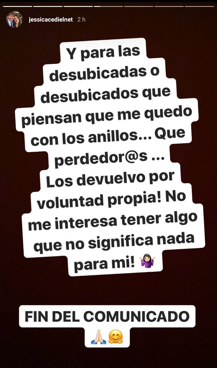 La también modelo señaló que de esta forma cierra su vida sentimental al público. “Soy consciente de que últimamente abrí la puerta de mi privacidad sentimental, pero después de aclarar este último capítulo queda cerrada”, escribió en otra historia.