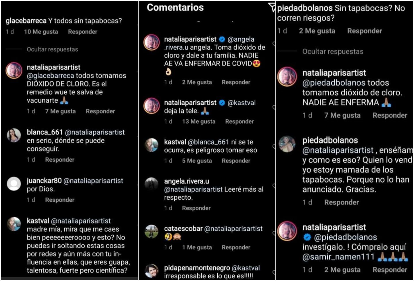 Varios usuarios de esa red social, al ver que nadie usaba mascarilla, le preguntaron si no estaban corriendo riesgo de contagios. La respuesta de Natalia París sorprendió por su irresponsabilidad pues, según ella, con el dióxido de cloro no es necesario vacunarse: "Todos tomamos DIÓXIDO DE CLORO. Es el remedio [sic] te salva de vacunarte".