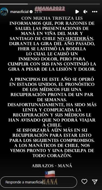 Relacionado con lo anterior, Maná pidió disculpas a los fans por las molestias ocasionadas y aseguró que Fher se esforzará y cuidará para estar pronto en el escenario.