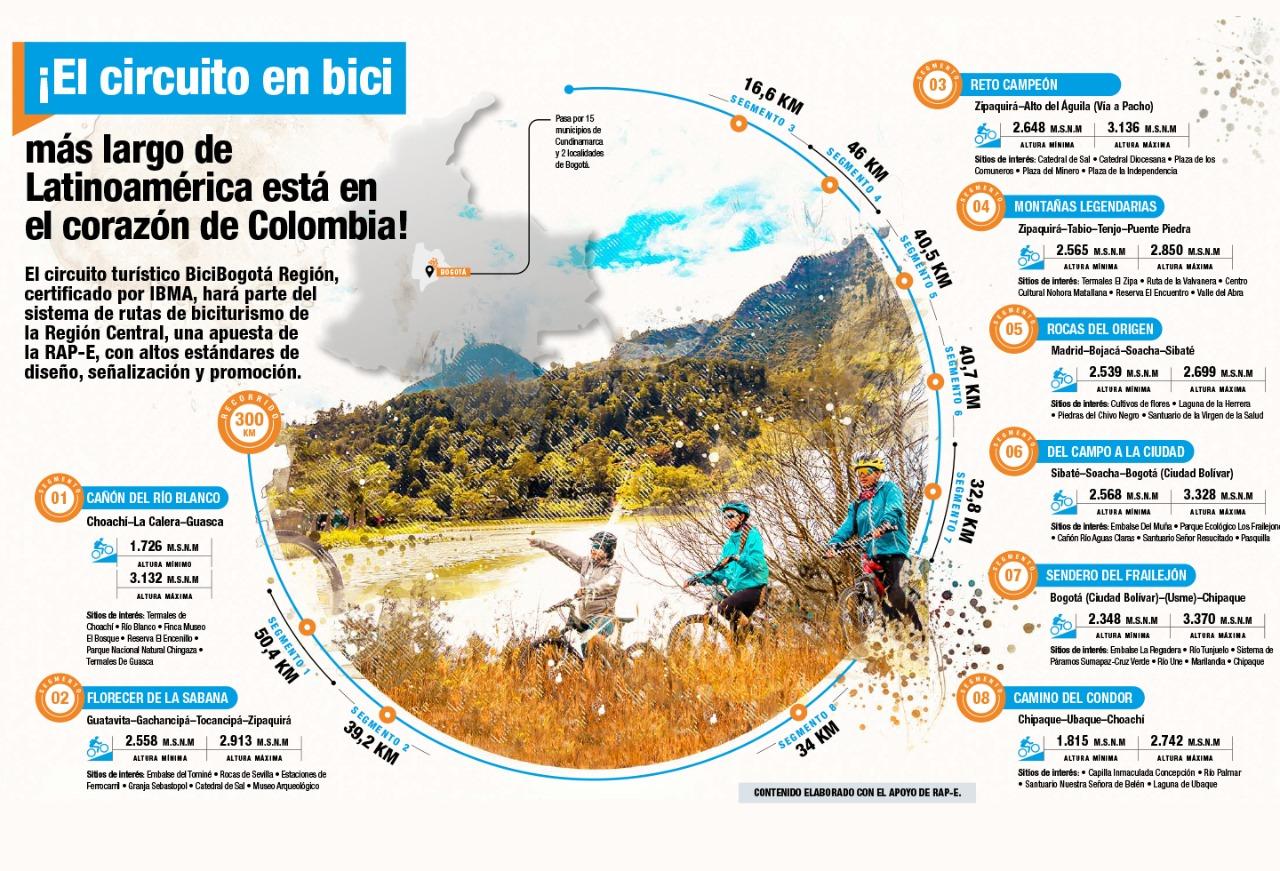 En este circuito de 300 kilómetros, a lo largo de Bogotá y 15 municipios emblemáticosde Cundinamarca, hay ocho segmentos de no más de 50 kilómetros, siete de ellos conformados por un circuito perimetral, más uno especial, que parten desde uno de los puntos de parada de la ruta.