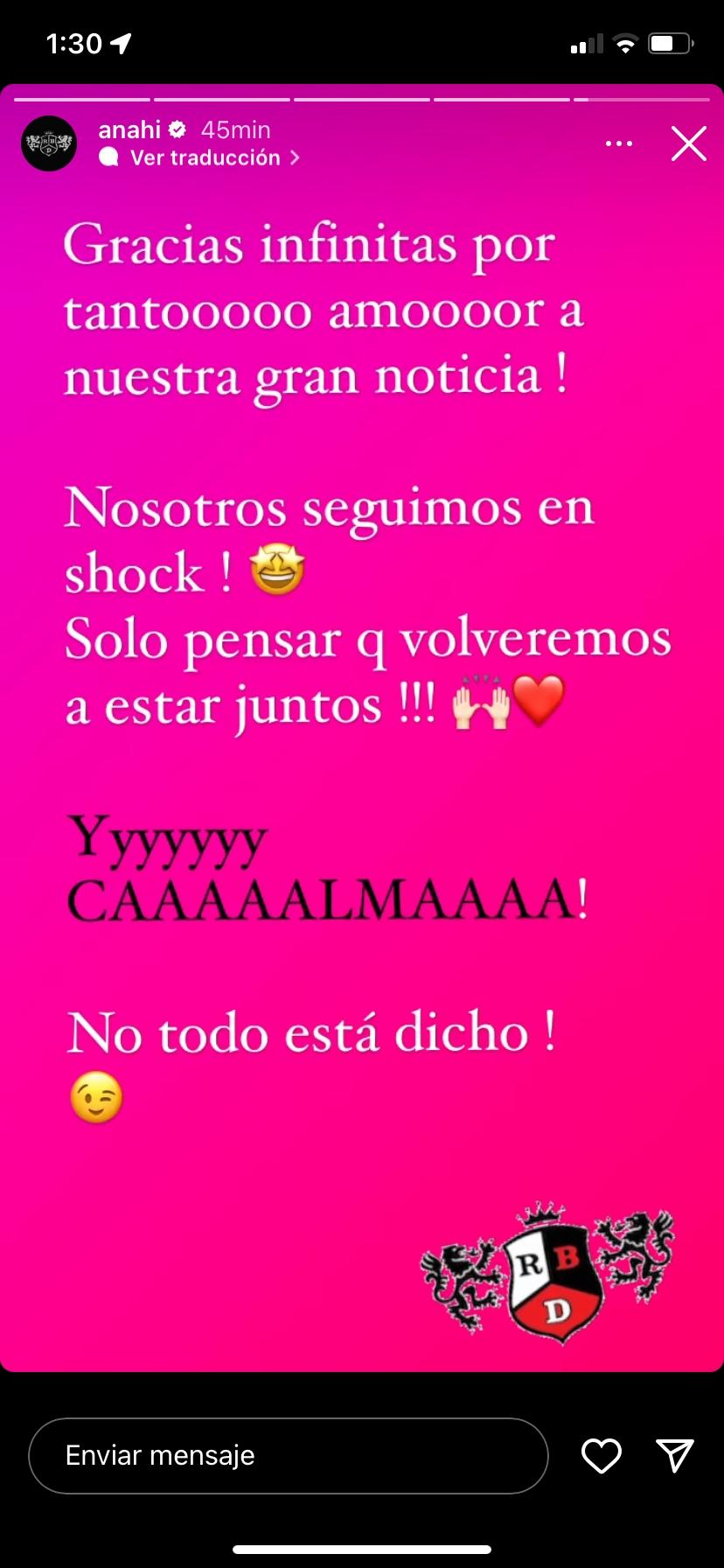 La cantante y actriz agradeció a sus seguidores por el amor recibido y resaltó la emoción que tienen los artistas por volver a los escenarios para presentarse como RBD, así mismo, pidió calma porque todavía hay algunas sorpresas pendientes.
