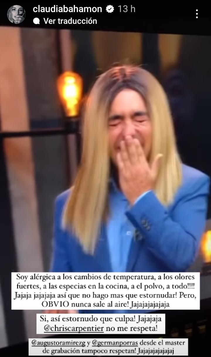 Ante esto, Claudia Bahamón no se quedó con esa y le respondió al chef a través de su cuenta de Instagram, y acompañando un pequeño video de lo que fue la imitación, dejó el siguiente mensaje “Soy alérgica a los cambios de temperatura, a los olores fuertes, a las especias en la cocina, al polvo, a todo!!!. Jajajajajaja así que no hago más que estornudar!, pero obvio nunca sale al aire. Si así estornuda, que culpa. Chris Carpentier no me respeta”, dejando ver la buena relación que tienen entre ellos, y además lo divertido que le pareció lo hecho por Carpentier.